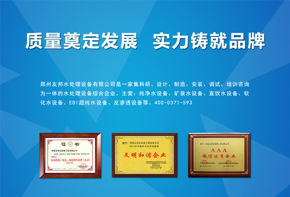 鄭州友邦水處理設(shè)備有限公司始創(chuàng)于2003年。自成立以來(lái),友邦始終堅(jiān)持以“客戶(hù)利益為保障”的原則,打造友邦口碑,備受客戶(hù)的認(rèn)可和信賴(lài)。鄭州友邦是一家專(zhuān)業(yè)從事水處理技術(shù)開(kāi)發(fā),設(shè)備制造生產(chǎn)及銷(xiāo)售的企業(yè)公司。嚴(yán)格的生產(chǎn)管理系統(tǒng)環(huán)環(huán)相扣,層層把關(guān)。從原材料選購(gòu)到現(xiàn)場(chǎng)調(diào)試安裝,鄭州友邦重視每個(gè)細(xì)節(jié)。公司以堅(jiān)持技術(shù)創(chuàng)新、質(zhì)量創(chuàng)優(yōu)、服務(wù)創(chuàng)佳的原則,以?xún)?yōu)質(zhì)的產(chǎn)品和專(zhuān)業(yè)的服務(wù)實(shí)現(xiàn)我們的承諾:把您擁有的水變成您需要的水!